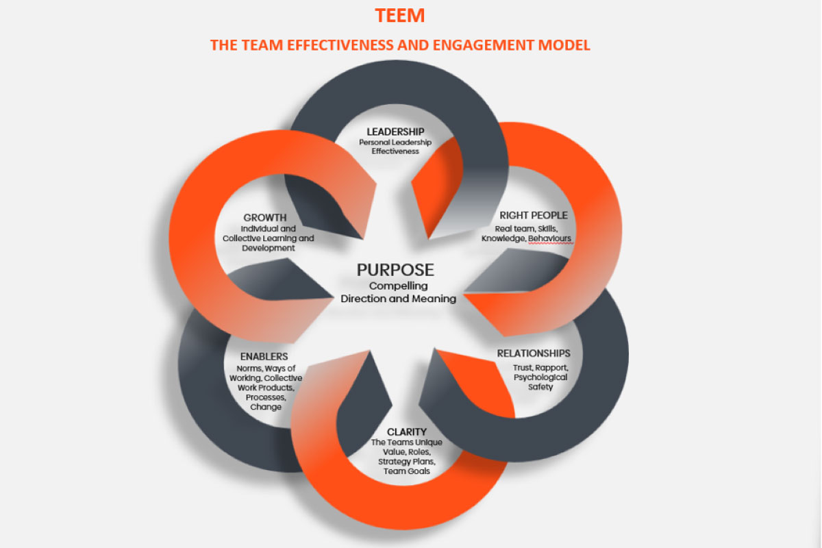 Put it all together, and you get TEEM: a system-wide way of diagnosing and strengthening team performance and engagement. Purpose, leadership, people, relationships, clarity, enablers, growth – the building blocks of effectiveness.